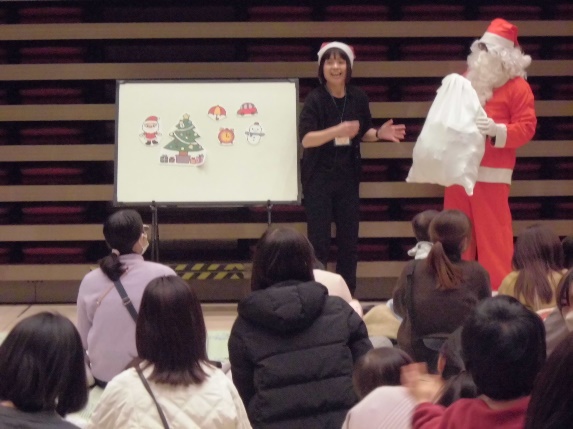 最後はブラックパネルシアターでクリスマスの歌に合わせていろいろなキャラクターが登場し、親子で「キレイだね」「おもしろいね」と楽しいひとときを過ごしました