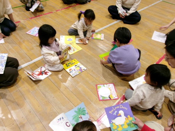 その後は英語についての保護者向けに講話があり、その間は子供たちは英語の絵本を見ていました。