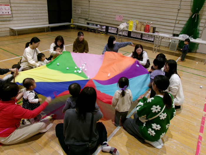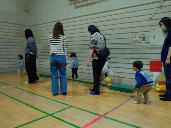 いつもと違う雰囲気の体育室に、緊張気味の面持ちで入ってきたお子さんが多くいらっしゃいましたが、ママと一緒に音楽に合わせて身体を動かしていると、笑顔がどんどん増えていきました!