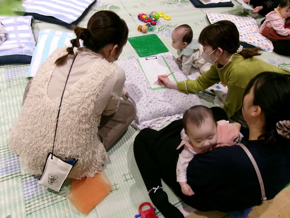 今回は初めて参加するママも多かったので、グループ対抗で「誕生日順並びゲーム」をして緊張をほぐし、リラックスして教室の時間を過ごす親子さんがたくさんいました。