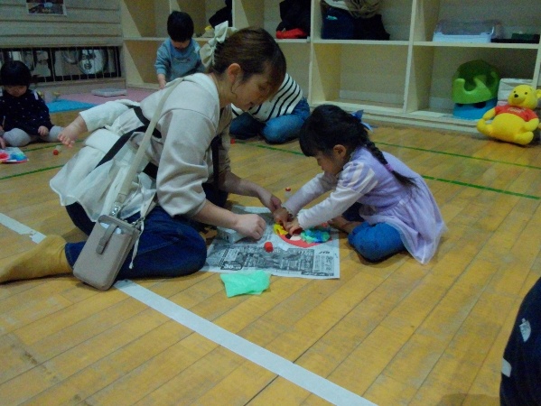 今年度、1回目の「おやこであそぼう」に、2・3歳親子が遊びに来ました。