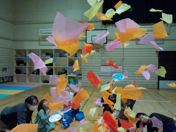 先生たちが新聞紙の雨を降らせると、子ども達は歓声をあげて大喜び!親子で楽しい時間を過ごしました。