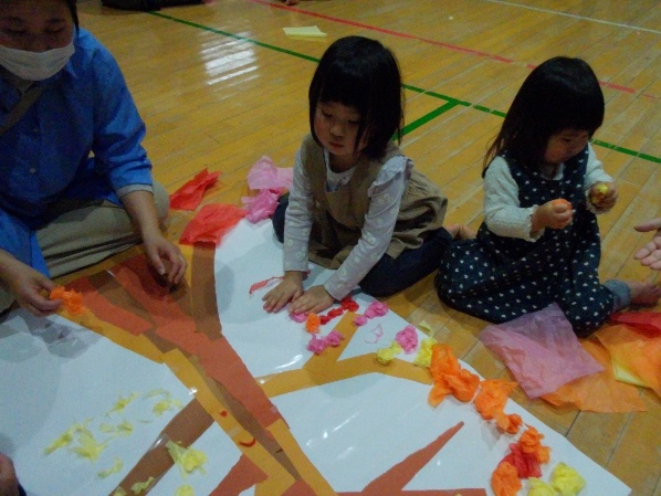 細かくちぎって貼ったり、丸めて貼ったり、大きくふんわりと貼ったり、親子で思い思いに紙を貼り、とても素敵な桜の木が完成しました。