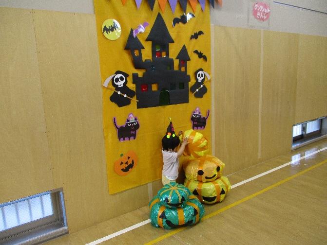 工作で一緒に作ったパーティ帽子をかぶり、ハロウィンの壁面飾りの前で記念撮影をする様子も見られました。