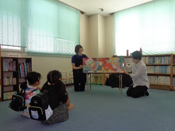 小学生の回では、大型絵本「めっきらもっきらどおんどん」の読み聞かせから始まり、夏にお決まりのおばけの絵本「ばけばけばけばけ ばけたくん」、「とべ バッタ」などこの季節にピッタリの内容でした。