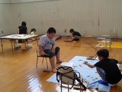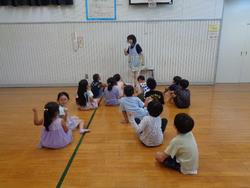 今回は2チーム分かれて「巨大オセロゲーム」とドッジボールを行いました。「巨大オセロゲーム」は表と裏が赤と白の丸い紙を自分のチームの色にひっくり返す遊びです。体育館は冷房が効いていましたがみんな夢中になって汗をかきながらゲームを楽しんでくれました。