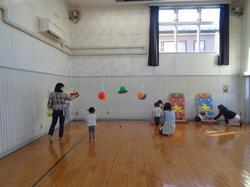 7月27日(土曜日)、体育室にたくさんの種類の「木の手作りゲーム」や「ジャンボコリント」を準備し、「浮き輪なげ」や「缶つみ」などにもチャレンジできる「夏のお楽しみ会」を行いました。