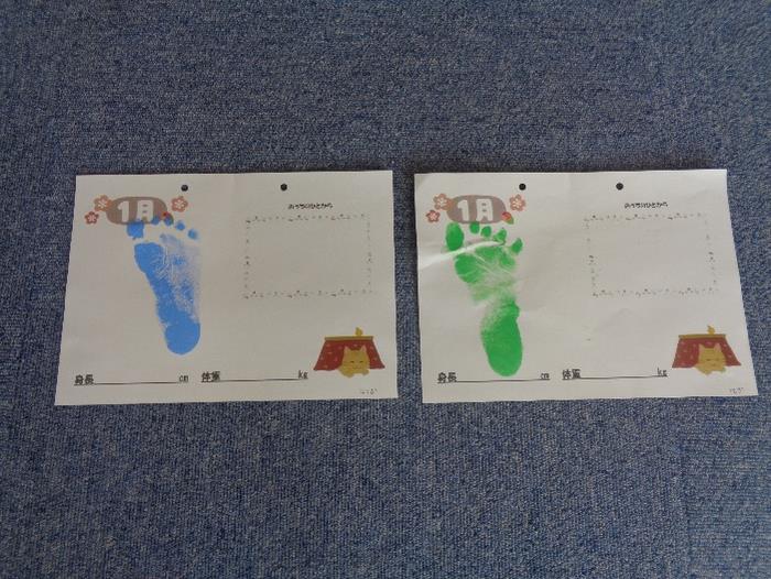 今回は足形取りからスタート!ピンクと青のインクでかわいい足形が取れました。