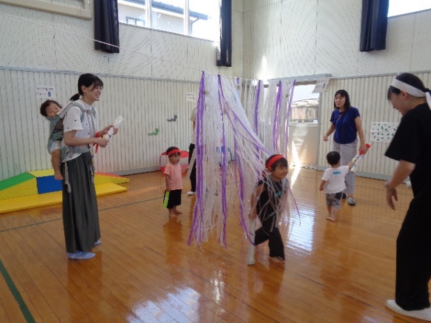 6月20日(金曜日)の「にこにこタイムプラス♪」では、太鼓のバチを持って7月に予定している「ちびっこなつまつり」で踊る「たいこドンドン」を踊ったり、ミニシアター「雨ふりくまのこ」を歌いながら見たり、お花紙をお母さん達にうちわであおいでもらい、うちわの風で巻き上げて遊びました。