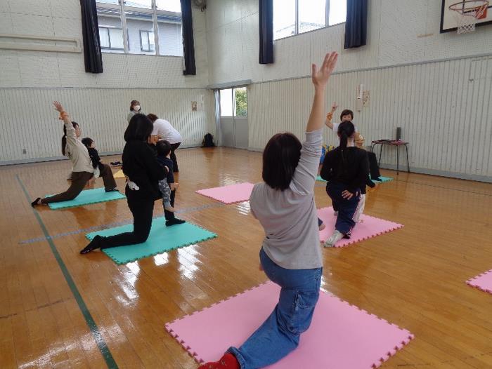 音楽に合わせて体をゆっくり伸ばしたり、お子さんを背中やお腹に乗せながら姿勢を整えたり、体幹を鍛えたりと、親子でふれあいながら進んでいきました。