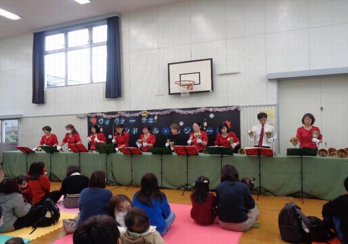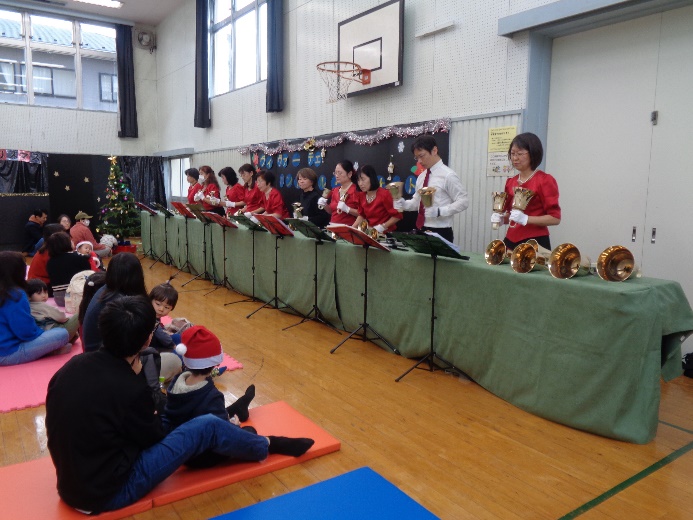 職員による「サンタ人形ダンス」で始まり、ハンドベルサークル「ヴィヴァーチェ・ハンドベルリンガーズ」さんによるハンドベルコンサートをしていただきました。