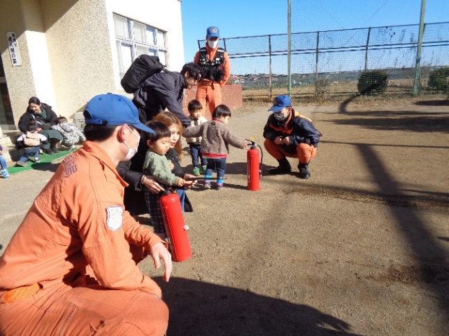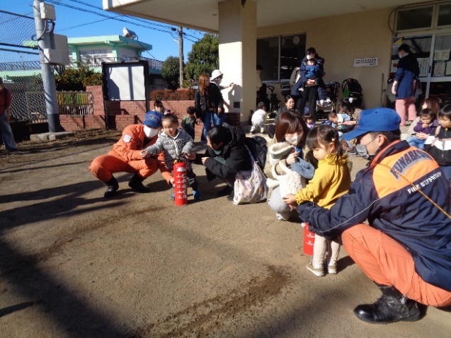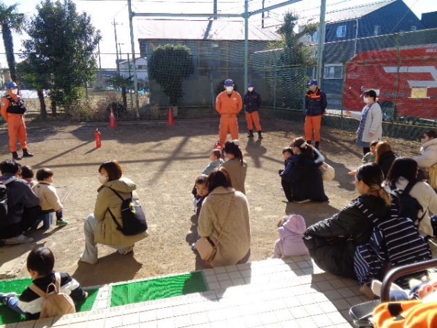 船橋北消防署三咲分署の消防士さんと消防車が来てくださり、避難訓練や水消火器の体験、また、お子さんには防火服の着用体験などをしていただきました。