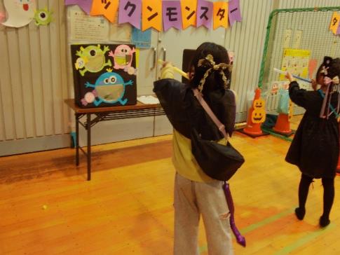 午後の小学生の部では、ターゲットボール・スーパーボールすくい・キラキラスライム・パックンモンスター・おばけキャンディーとコーナー遊びを行い、繰り返し夢中で遊んでいた小学生達。