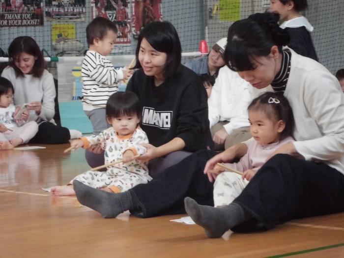 そしてカエルになってぴょんぴょん飛び跳ねたり、太鼓のばちをもっておおきなたいこ、ちいさなたいこをたたいてみたり盛りだくさんの30分間、親子で楽しく過ごす姿が見られました。
