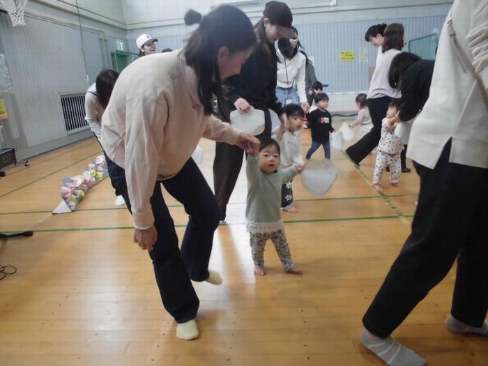 ピアノやトライアングルの音に合わせて歩いたり、止まったり、小走りをしたりと親子で楽しむ姿が見られました。