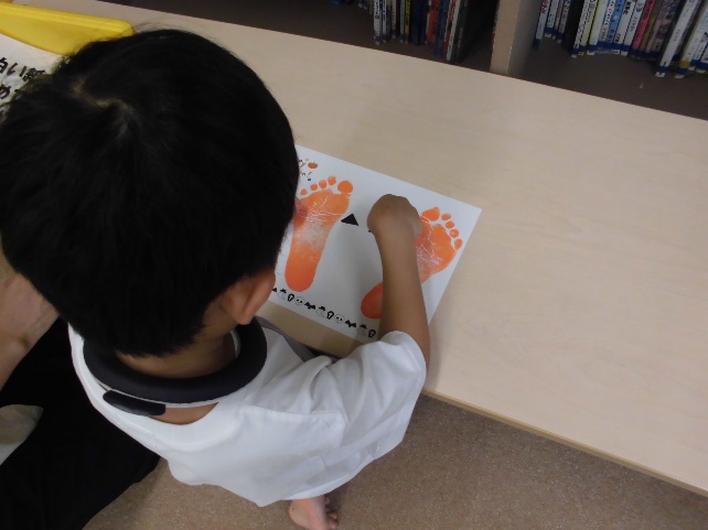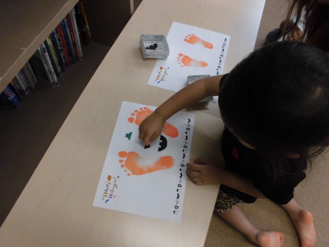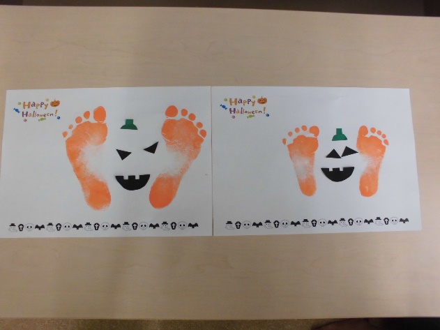 今回は早めのハロウィンバージョン!両足の足形をぺったん!目と口を貼って可愛いカボチャの出来上がり‼記念になると喜んでもらえました。