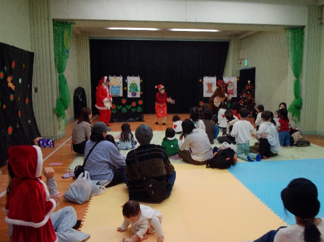 職員によるマジックショーやパネルシアターを楽しんだあと、鈴の音が聞こえて園長サンタさんとトナカイさんがプレゼントを持って登場!
