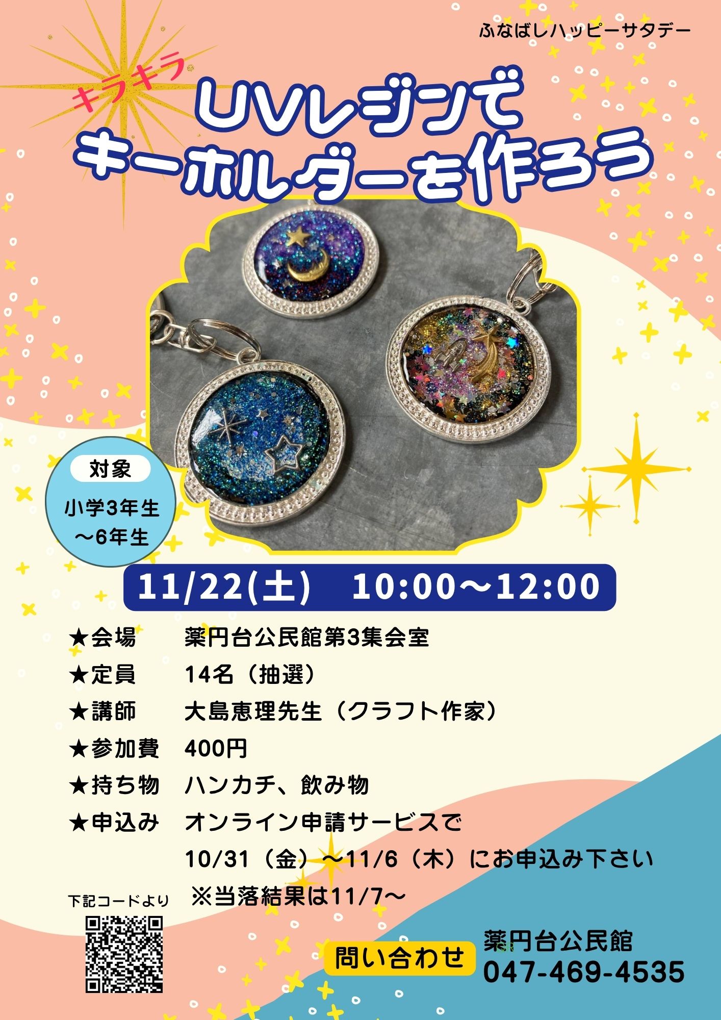 | 11月22日土曜日 | UVレジンでキラキラキーホルダーを作ろう | 10時~12時 | 14名※抽選 | 小学3~6年生 | 飲み物、ハンカチ | 400円 | 薬円台公民館第3集会室 | 詳細はこちらから |