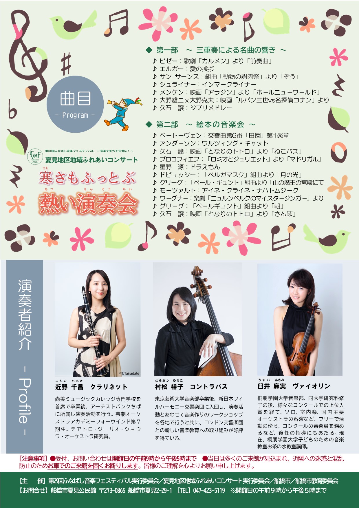 【出 演】 村松裕子(コントラバス)、近野千昌(クラリネット)、臼井麻実(ヴァイオリン)
